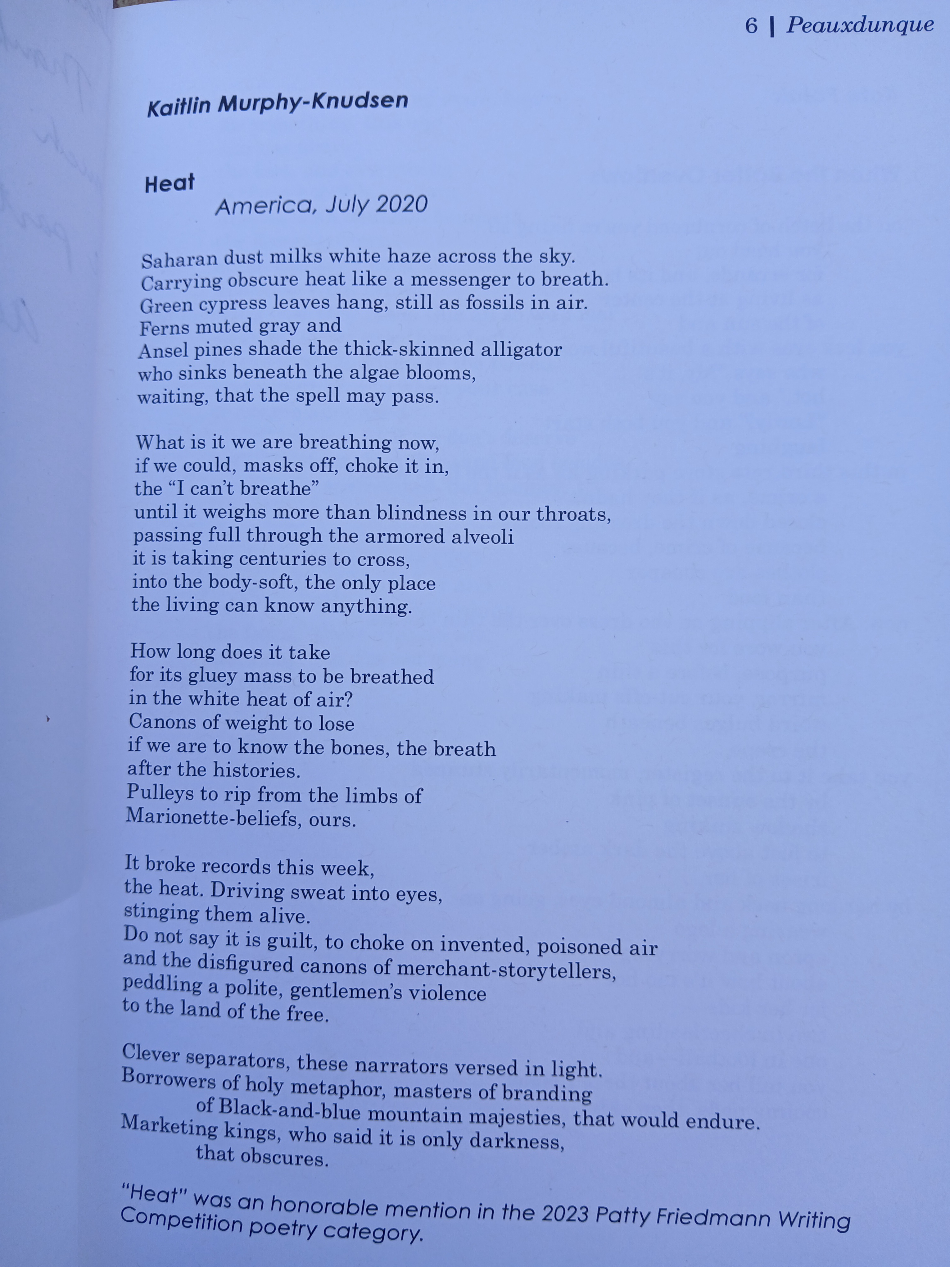 * "Heat" (poetry), Honorable Mention in the 2023 Patty Friedmann Writing Competition from
